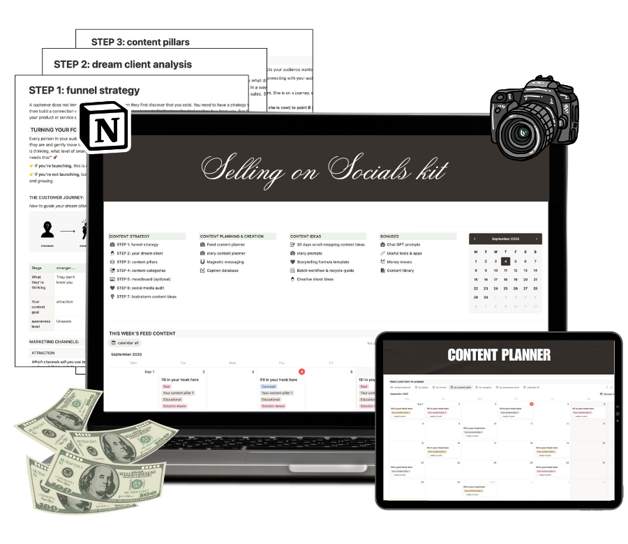 The Selling on Socials strategy is your all-in-one system to plan, create, and sell on social media — without needing a big audience or spending hours guessing what to post.