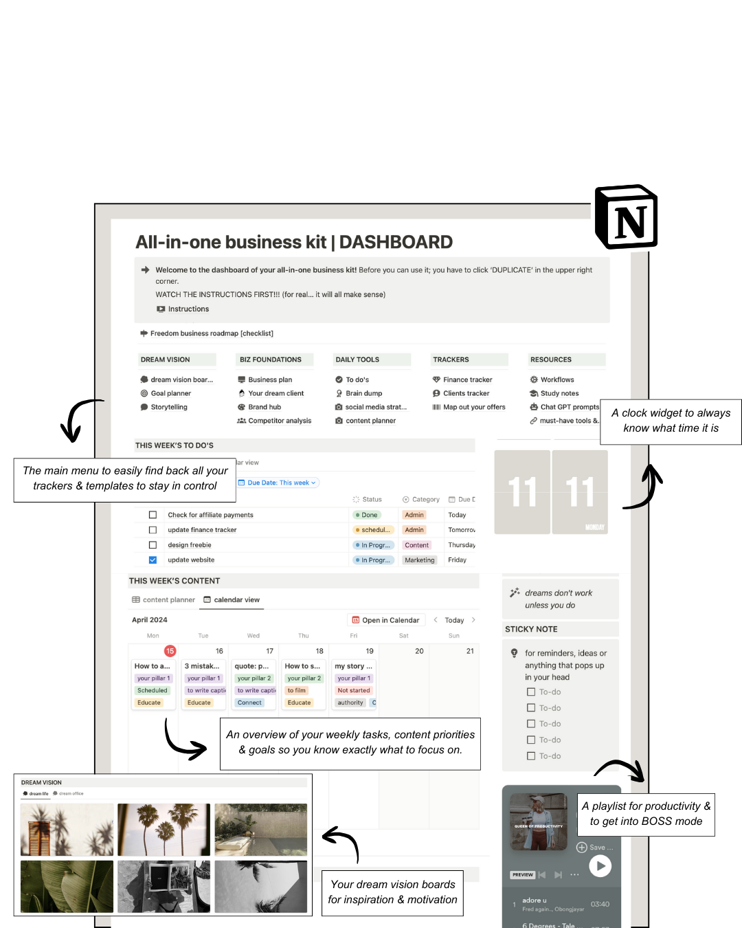 Stay on top of your to-do’s, brain-dump ideas, plan your social media, and map out your content calendar.